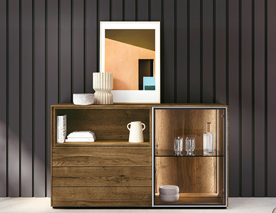 - En el salón: Las vitrinas y aparadores modernos, además de ser piezas decorativas, ofrecen un espacio considerable para tener a punto por ejemplo la cristalería, vajilla, cubertería o mantelerías que no usas a diario. El cristal permite exhibir además objetos de decoración seleccionados que complementen su funcionalidad. Los muebles de TV con almacenaje oculto te permiten, por otro lado, guardar todo tipo de objetos útiles pero que no quieres tener a la vista: desde cables, cargadores, o mandos distancia, hasta piezas habituales de decoración que prefieres retirar para dejar espacio a otras más navideños como belenes, velas, centros o caminos de mesa y bandejas o cuencos. Así evitarás sobrecargar visualmente el ambiente.